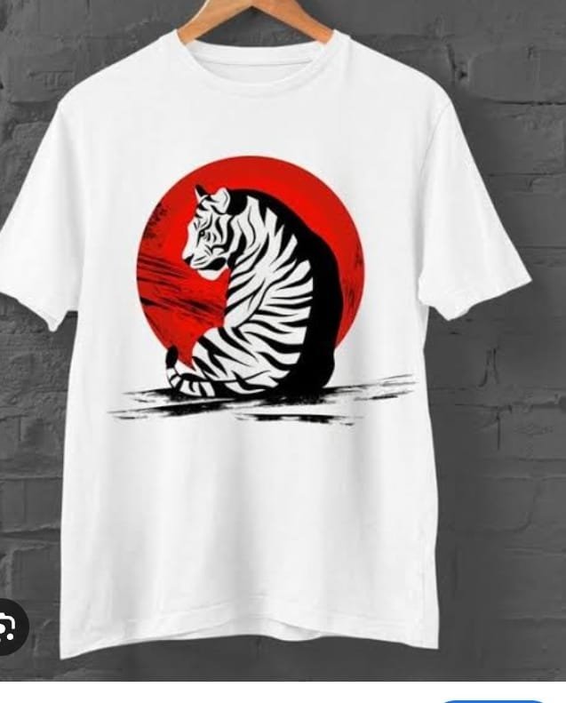 A crisp white tee featuring a striking graphic of a tiger sitting in profile against a bold red circle, reminiscent of a rising sun. The tiger’s black and white stripes pop against the red backdrop, creating a powerful and stylish design.