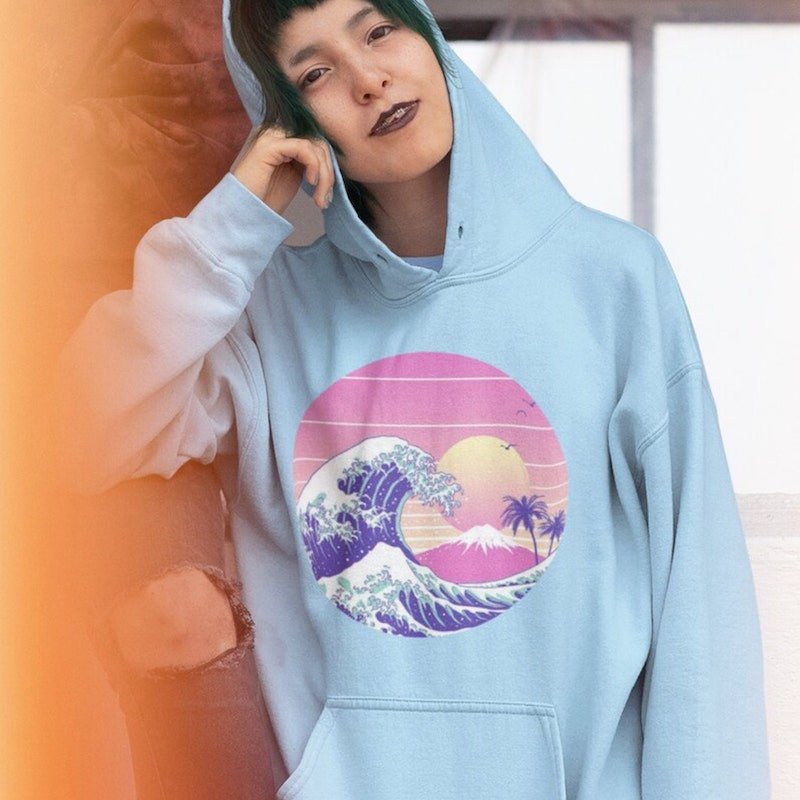 The Wave Sunset Hood is a cozy, light blue hoodie with a captivating graphic.