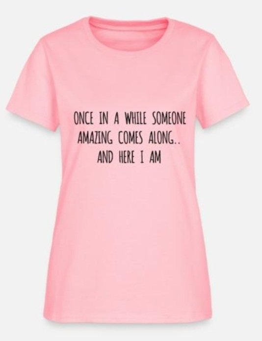 The real showstopper, though, is the quirky text emblazoned across the front in a crisp, black font. “ONCE IN A WHILE SOMEONE AMAZING COMES ALONG.. AND HERE I AM” is printed in a slightly quirky, handwritten-style typeface that adds to the tee’s charm. The text is split into three lines for readability and impact: