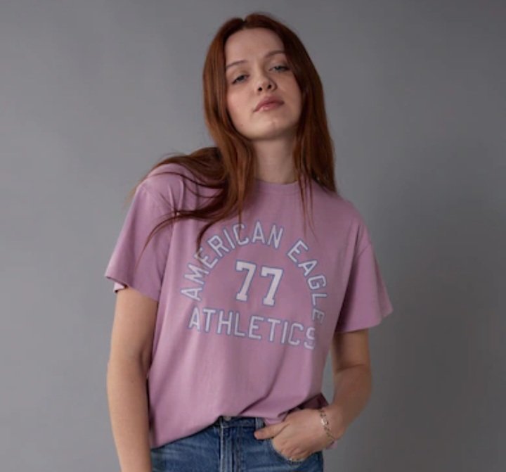 She’s wearing a dusty pink t-shirt with the words “AMERICAN EAGLE ATHLETICS” printed in a circular pattern around the number “77” in the center. The text is in light blue with a slightly faded look, giving the shirt a laid-back, worn-in feel. The t-shirt is a bit oversized and has short sleeves, fitting comfortably on her frame.