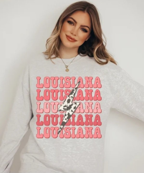 The sweatshirt is a light gray color, providing a neutral canvas for the vibrant design emblazoned across the chest. In a stacked formation, the word “LOUISIANA” is repeated five times in a bubbly, pink font with a hint of retro charm. This repetition creates a dynamic visual effect, drawing the viewer’s eye to the graphic. Cutting through the middle of these stacked words is a stylized lightning bolt, adding an edgy touch to the overall design. The lightning bolt itself features a cow print pattern in black and white, injecting a bit of wild, country flair into the mix. This combination of playful typography, bold graphics, and a hint of Southern eccentricity makes for a design that’s both eye-catching and memorable.