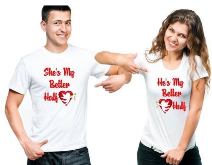 The background of the image is a clean and neutral white, which helps to focus attention on the couple and their matching outfits. The overall vibe of the image is light-hearted, playful, and romantic, emphasizing the bond between the two individuals. The use of the phrase “Better Half” is a sweet nod to the idea of partnership and togetherness, suggesting that each person considers the other to be their perfect complement.