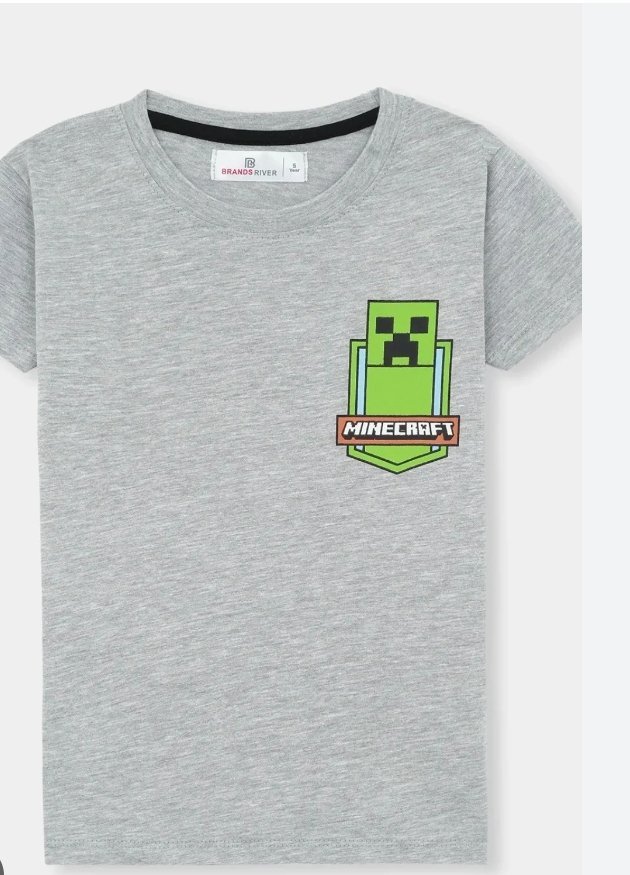 The image showcases a stylish and trendy kids’ t-shirt with a captivating Minecraft theme. The t-shirt itself is a light gray color with a subtle heathered texture, giving it a soft and comfortable look. The neckline features a black inner lining, adding a touch of contrast to the overall design.