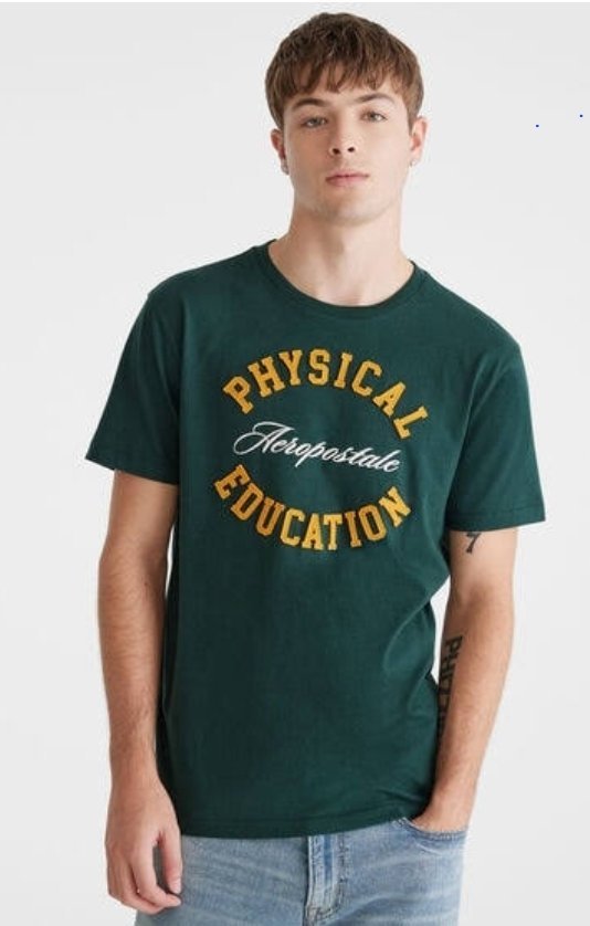 – *Colors:* Dark green tee, yellow text, white cursive for “Aeropostale”, light blue jeans, white bg.