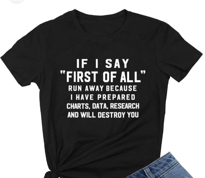 The “Data Destroyer Tee” is a bold and humorous black t-shirt that speaks volumes about the wearer’s preparedness and confidence in debates, discussions, or any form of intellectual sparring. Emblazoned in crisp white text across the front of the shirt is a witty warning that reads: “IF I SAY ‘FIRST OF ALL’ RUN AWAY BECAUSE I HAVE PREPARED CHARTS, DATA, RESEARCH AND WILL DESTROY YOU.”