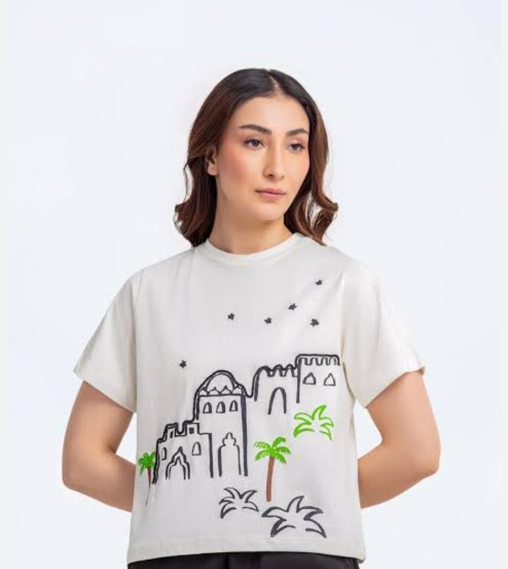 The image features a young woman modeling a white t-shirt with a unique graphic design. Here’s a breakdown of the details: