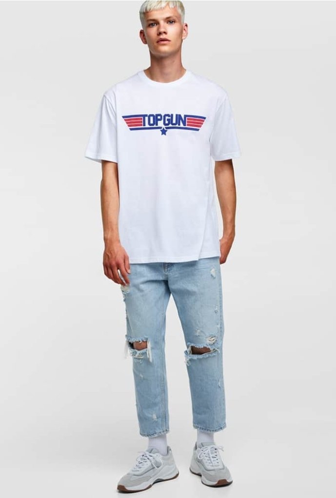 In terms of fashion, this outfit is versatile enough for various casual settings—think hanging out with friends, going to a casual event, or just a laid-back day out. The “Top Gun” graphic on the tee is a clear nod to fans of the movie or those who like aviation-inspired fashion. The ripped jeans bring a touch of modern streetwear into the mix, while the white sneakers keep the look grounded and approachable.