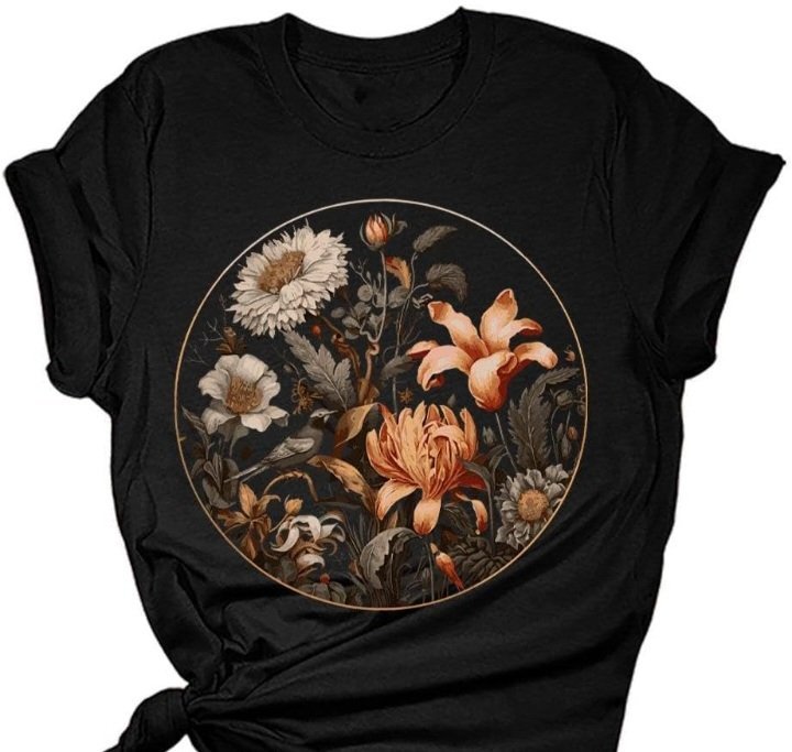 This tee could pair well with jeans for a casual look or with a skirt for a slightly more polished outfit. The design’s neutrality in terms of theme (floral with a dark twist) makes it appealing to a broad audience.