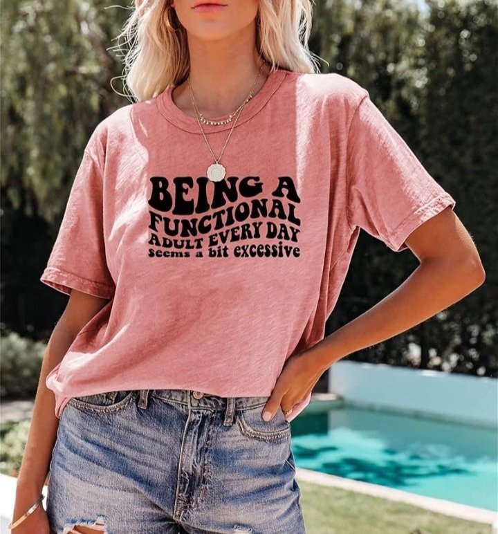 The quote on the t-shirt is a playful take on the challenges of adulting. “Being a functional adult” implies handling responsibilities and daily tasks effectively, but the addition of “every day seems a bit excessive” adds a humorous touch, suggesting that living up to those expectations daily can feel overwhelming or too demanding. The overall vibe of the image is casual, relaxed, and somewhat tongue-in-cheek about adult responsibilities.