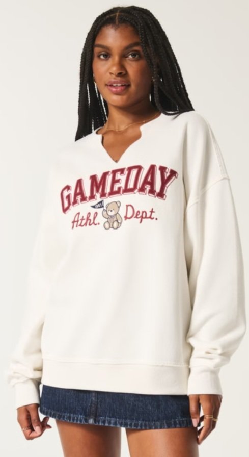 The model in the image embodies a laid-back, sporty look that’s ideal for a day out or a casual game-day event. She’s wearing a white sweatshirt with a striking red “GAMEDAY” print across the chest, accompanied by “Athl. Dept.” in a playful cursive script below. A tiny teddy bear holding a megaphone adds a whimsical touch to the design, blending athletic spirit with a hint of fun and nostalgia. The sweatshirt has a relaxed fit with long sleeves and a slight V-neck, contributing to the effortless coolness of the outfit.