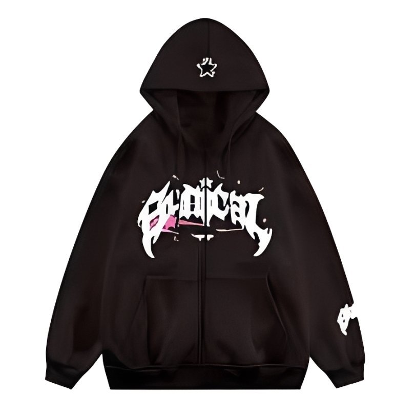 A black hoodie with a zipper closure and a large “Ghost” graphic in white gothic-style letters across the chest. The word “Ghost” has pink accents and splashes above it. A small logo is visible on the hood and another small logo is on the left sleeve. The hoodie has a front pocket and is presented against a plain white background, showcasing the design details.
