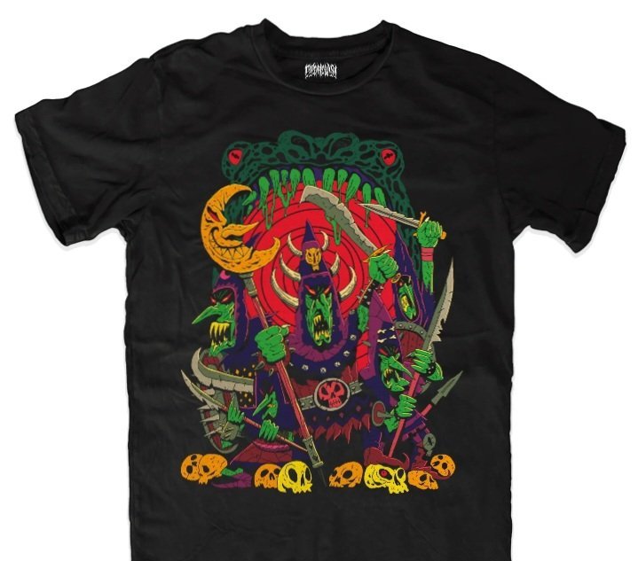Overall, the “Gothic Havoc” design is perfect for fans of dark fantasy, Halloween themes, or anyone drawn to the mystical and eerie side of art. The combination of vibrant colors against the dark backdrop, along with the twisted elements of fantasy creatures and skeletal motifs, makes for a shirt that tells a story of dark magic and impending doom in a visually stunning way.