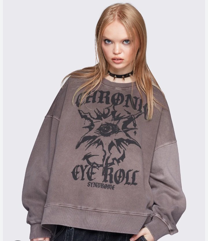 – *Attire:* She wears a taupe-colored sweatshirt with bold, black graphic print. The print features the words “CHRONIC EYE ROLL SYNDROME” in a gothic-inspired font, accompanied by an illustration of an eye surrounded by sharp, jagged lines resembling sun rays or thorns. This gives the outfit a dark, rebellious vibe.