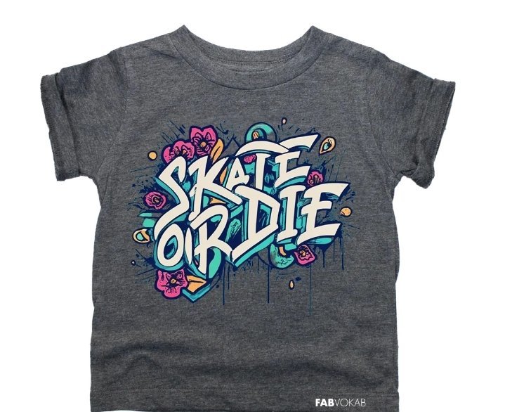 This dope gray t-shirt is flaunting a killer graphic that screams street style! π₯ The main attraction is the bold, graffiti-inspired text “SKATE OR DIE” in white letters with a rad turquoise outline. The letters are chunky, playful, and totally giving off that urban, edgy vibe. π