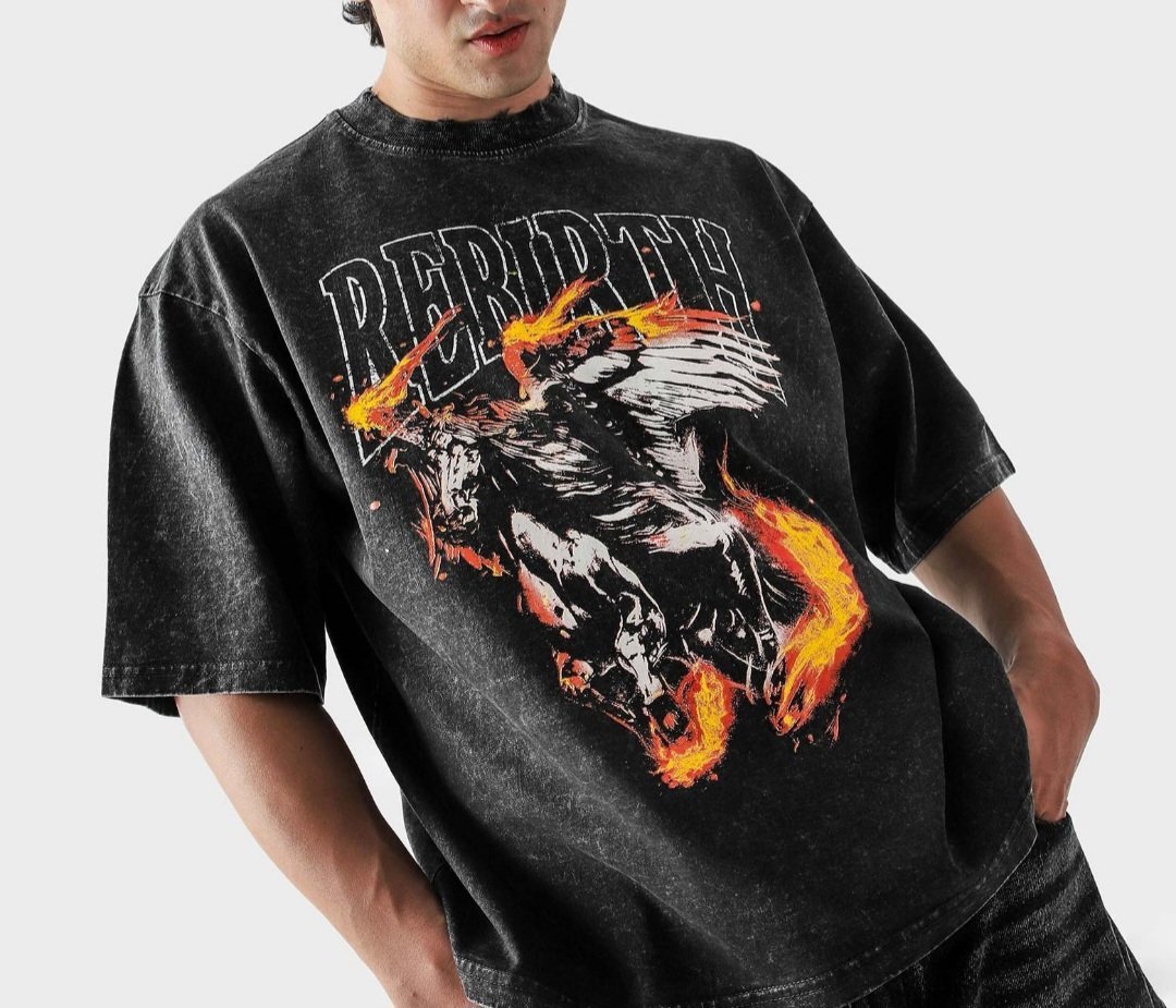 The image shows a close-up of a person wearing a black t-shirt with a striking graphic design. The design features a large, oval-shaped portal that appears to be made of a 3D mesh pattern, creating a tunnel-like effect. Through this portal, a blue sky with fluffy white clouds is visible, giving the impression of looking through a hole in the shirt into the sky. The person's arms are partially visible, showing muscular forearms and wrists adorned with black and white striped wristbands. The person is also wearing khaki pants on one side, visible at the bottom left.