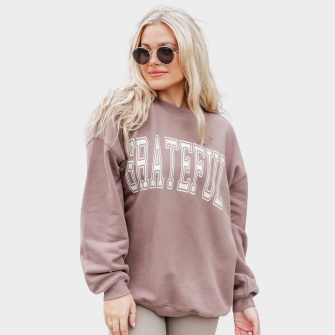 – The word “GRATEFUL” on the sweatshirt emphasizes positivity and mindfulness. It suggests an attitude of appreciation in daily life, aligning with wellness and mindful fashion trends.
