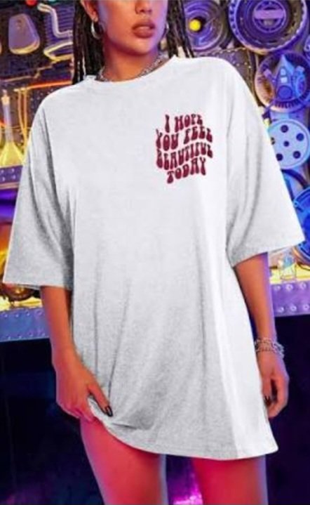 The “Grave Vibes Tee” is a captivating piece of streetwear fashion embodied by a woman standing confidently in front of a neon-lit, retro-inspired backdrop. The model wears an oversized, light gray t-shirt that hangs loosely on her frame, creating a laid-back yet edgy silhouette. The tee itself is the focal point, adorned with a striking graphic on the upper left chest area. In bold, crimson-red letters arranged in a staggered, wavy pattern, the phrase “I HORA YOU ZELL GRAVEFUL TODAY” is emblazoned. The typography is quirky and somewhat distorted, adding to the tee’s unique aesthetic appeal.