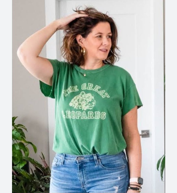 The image features a woman posing in front of a white door. She’s wearing a green t-shirt with white text that reads “THE GREAT LEOPARDS” and a leopard graphic in the middle. Her brown hair is styled in a casual, wavy look, and she’s touching her hair with her right hand. She’s also wearing blue jeans with some distressing on them, gold hoop earrings, a small gold necklace, and a watch along with some bracelets on her left wrist.