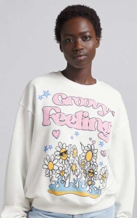 The image showcases a young woman exuding a laid-back, trendy vibe while wearing a standout piece of clothing – a white sweatshirt with an eye-catching graphic design. The aesthetic of this outfit and the overall mood of the image blend elements of retro charm with a modern twist, creating a captivating visual.