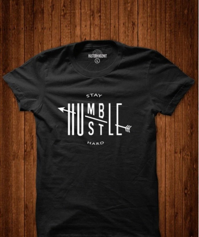 At the center of the shirt, the word “HUSTLE” is prominently displayed in large, stylized white letters, cleverly integrated with the word “HUMBLE”. The design is accentuated by two arrows on either side of “HUMBLE HUSTLE”, pointing outward, symbolizing growth, progress, and the outward momentum of one’s efforts. Above the main text, in smaller yet impactful letters, is the directive “STAY”, urging the wearer and onlooker alike to maintain this mindset. Below, the word “HARD” reinforces the idea of putting in earnest effort without boasting.