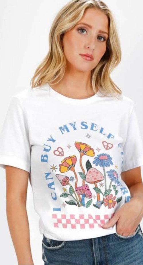 Above the floral and mushroom arrangement, the phrase “I CAN BUY MYSELF” is curved in blue letters, making a statement that’s both empowering and catchy. The text is playful yet confident, suggesting independence and self-sufficiency in a lighthearted way.