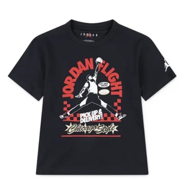 Encircling the top of this action figure in bold, curved red letters are the iconic words “JORDAN FLIGHT,” paying tribute to the brand’s legacy of elevating basketball to new heights. Below the player’s silhouette, against a striking red and black checkered backdrop that adds a touch of street style, the phrase “PICK UP & DELIVERY” is emblazoned in crisp white and red text. This adds a playful nod to the idea of taking the game to new levels, both on and off the court.