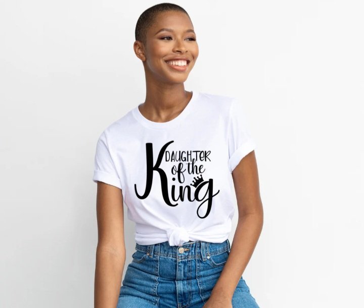 – *Text:* The t-shirt has “Daughter of the King” written on it in a mix of fonts. “Daughter” and “King” are in a handwritten/cursive-like font, while “of the” is in a simpler, smaller script.