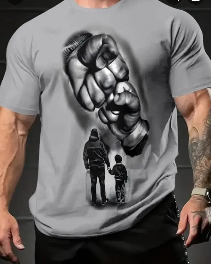 The tee is a gray short-sleeved T-shirt with a striking black-and-white graphic design. The design features a massive clenched fist looming over two figures – an adult and a child – walking hand-in-hand away from the viewer. The adult is wearing a hoodie and pants, while the child is dressed in a smaller version of similar attire. The background of the graphic has a subtle shadow effect, adding depth to the design. The shirt is worn by a muscular man with tattoos on his left arm, standing against a dark gray background.