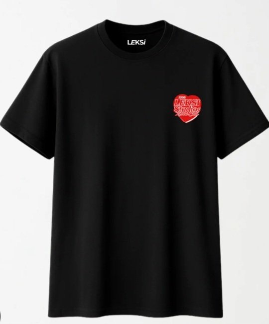 The focal point of the “Leksi LoveBeat” tee is the vibrant red heart graphic positioned on the left chest area. Inside this heart, the words “LEKSI STUDIOS” are written in a stylized red font that contrasts beautifully with the black fabric of the shirt. The heart shape adds a playful, youthful vibe to the design, while the bold red color injects a sense of energy and passion. The combination of the heart graphic with the brand name creates a look that’s both trendy and endearing.