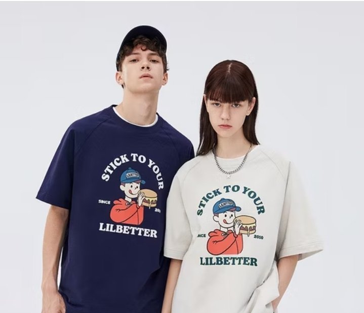 – *Female Model:* Beside him, the young woman wears a white tee with the same “STICK TO YOUR LILBETTER” graphic but in green letters. Her version of the cartoon character mirrors the one on the male’s tee. She adds a touch of elegance with a necklace and showcases long dark hair with bangs.