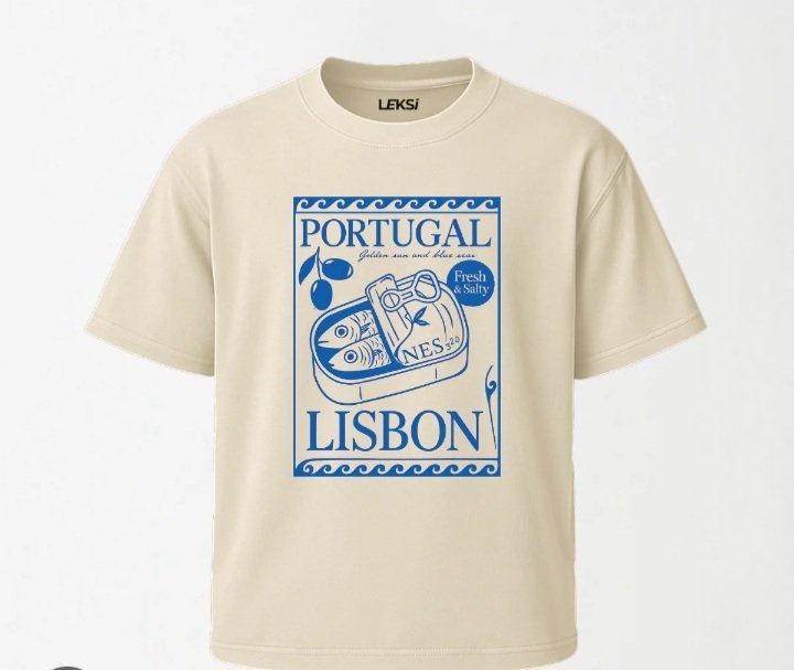 In terms of aesthetics, the “Lisbon Vibes” tee balances simplicity with intricate details. The contrast between the off-white fabric and the bold blue graphic creates a visually appealing look that’s both modern and rooted in tradition. The design elements—sardines, olives, decorative borders—tell a story of Lisbon’s coastal culture, making the shirt more than just apparel but a wearable piece of art inspired by Portugal.
