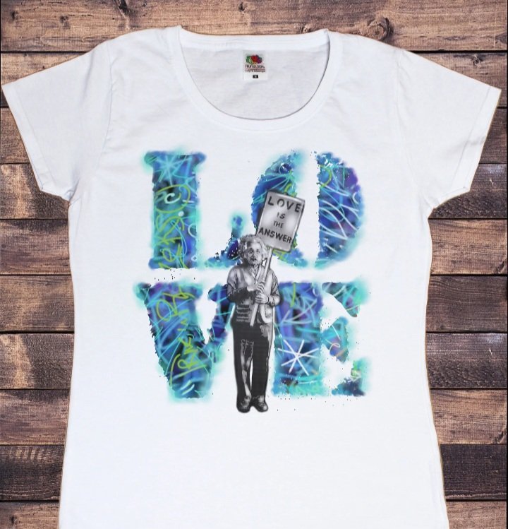 In terms of style, the shirt seems to cater to those who appreciate a mix of intellectual references, artistic graphics, and messages that provoke thought or express positivity. The use of Albert Einstein—a symbol of genius and intellectual pursuit—alongside the message about love adds layers of meaning to the design. Overall, the T-shirt is a blend of art, philosophy, and fashion, likely appealing to individuals who value unique designs that carry deeper meanings.