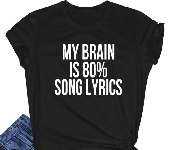 In summary, the “Lyric Lull” tee with its “MY BRAIN IS 80% SONG LYRICS” design is a fun, relatable piece of clothing. It combines a catchy statement with a laid-back style, making it appealing to music lovers looking to express their connection to the tunes that fill their minds.