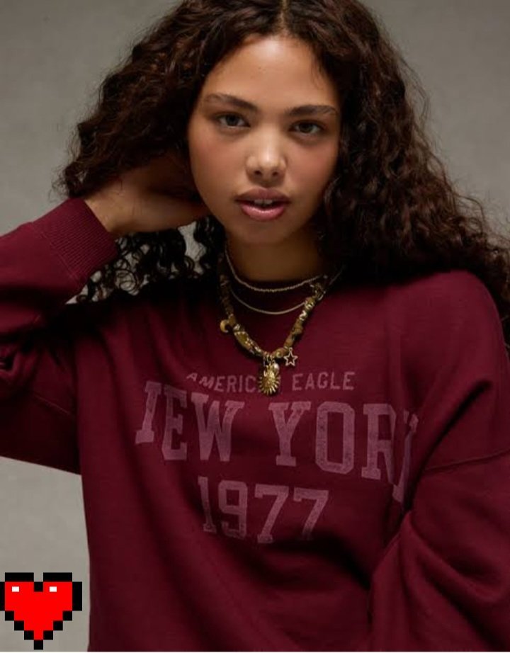 The “Maroon Muse” embodies a captivating blend of urban chic and effortless coolness, as seen in the image of the young woman posing in a striking maroon sweatshirt. The sweatshirt itself is a standout piece, adorned with faded light pink letters that spell out “AMERICAN EAGLE NEW YORK 1977.” This nostalgic nod to the brand’s heritage adds a layer of vintage appeal to the overall aesthetic.