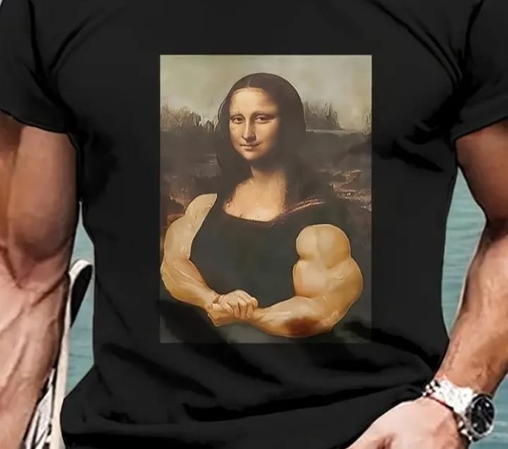 This image shows a man wearing a black t-shirt with a humorous graphic print. The print is a playful twist on the famous painting “Mona Lisa” by Leonardo da Vinci. In this version, the Mona Lisa is depicted with muscular arms, flexing her biceps in a bodybuilder pose. The background of the graphic retains the original landscape elements of the painting, blending the classic art with a comical, modern twist. The man wearing the shirt has muscular arms and is accessorized with a silver watch on his left wrist. The backdrop of the image features a blurred view of water, possibly a lake or sea.