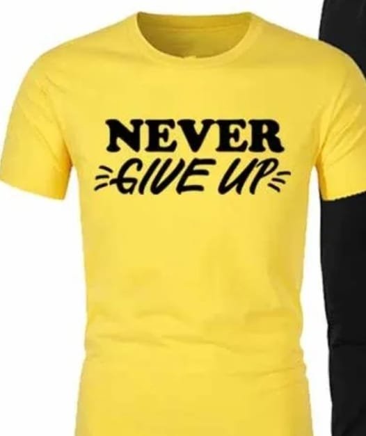 This tee is a bright yellow, short-sleeved crew neck T-shirt with a bold motivational message printed on the front. The text “NEVER GIVE UP” is prominently displayed in black, with “NEVER” in a blocky font and “GIVE UP” in a stylized cursive font. Lines burst out from the sides of “GIVE UP”, adding a dynamic touch to the design