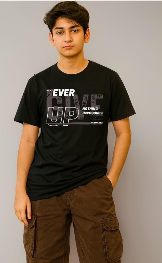 The star of the show is undoubtedly the black T-shirt he’s wearing. Emblazoned across the front in bold, contrasting white and gray letters is the motivational mantra: “*NEVER GIVE UP*” with “*NOTHING IMPOSSIBLE*” written beside it. The text is stylized in a way that makes it look like a stamp or a graphic overlay, adding an edgy touch to the design. The shirt itself is a bit twisted at the bottom, giving it a casual, lived-in look that complements the cargo pants perfectly.