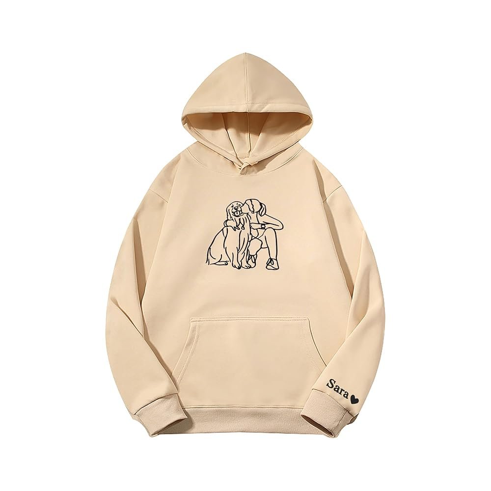 This is a beige hoodie with a hood and a kangaroo pocket. On the front, there’s a line drawing of a person sitting with their arm around a dog. The sleeve on the right has “Name” printed with a small heart next to it.