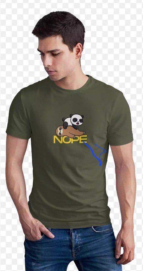The image depicts a young man wearing an olive green t-shirt with a quirky graphic design on it. The design features a cartoon panda sitting on top of a sloth, with the word “NOPE” written in bold, yellow letters underneath the animals. A blue squiggle or arrow-like mark is drawn to the right of the design, possibly highlighting or drawing attention to the graphic.