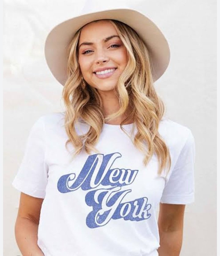 – *Shirt*: She’s wearing a white, short-sleeved T-shirt with “New York” written in blue glittery cursive letters across the chest.