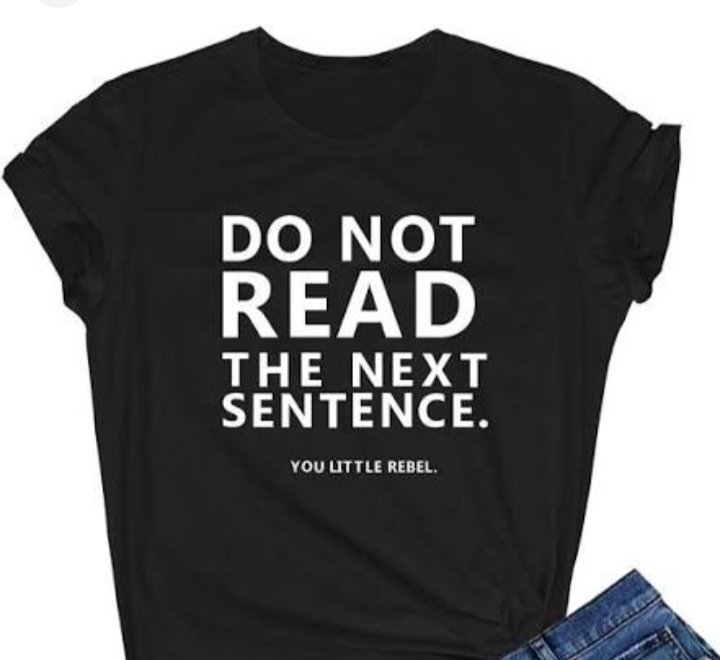 Below the main directive, in a smaller yet still legible font, the words “YOU LITTLE REBEL.” add a playful twist. This secondary text acts as the “next sentence” the wearer was initially warned not to read, creating a humorous loop of interaction between the design and its audience. The term “YOU LITTLE REBEL” is a tongue-in-cheek nod to the wearer, suggesting they’re part of a whimsical rebellion against the instruction printed above. It adds a layer of personality to the tee, making it more than just a graphic—it’s a conversation starter.