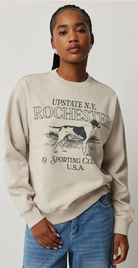 The image captures a striking portrait of a young woman exuding casual chic with a blend of vintage and sporty aesthetics. She’s wearing a cream-colored sweatshirt that immediately draws attention with its graphic print. The sweatshirt features bold typography and an illustration that reads “UPSTATE N.Y. ROCHESTER” at the top, accompanied by a graphic of a black and white dog, likely an English Pointer given its distinctive coat pattern. Below the dog illustration, the text “19 SPORTING CLUB U.S.A.” is printed, adding a touch of heritage and outdoorsy flair to the garment.