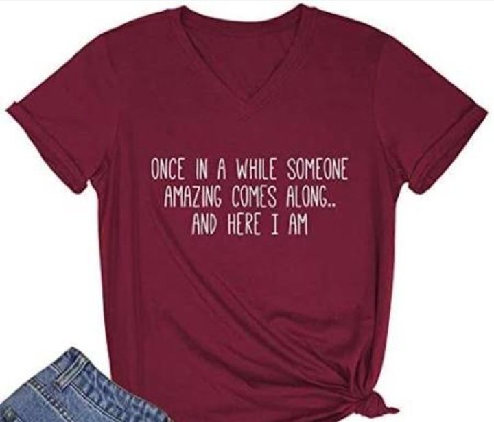 The “Self-Amusing Marvel” tee is a quirky, maroon-colored V-neck shirt that boasts a playful yet cheeky message. The shirt features white text that reads, “ONCE IN A WHILE SOMEONE AMAZING COMES ALONG.. AND HERE I AM.” The text is laid out in a casual, handwritten-style font across three lines, giving the shirt a laid-back, humorous vibe.