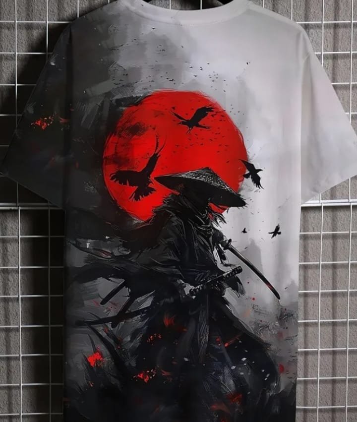 This white t-shirt features a dramatic graphic design of a samurai in black attire, holding a sword and wearing a traditional conical hat. The design is set against a bold red sun with black crows flying around it, creating a striking contrast. The overall aesthetic blends elements of Japanese culture with a dark, moody vibe