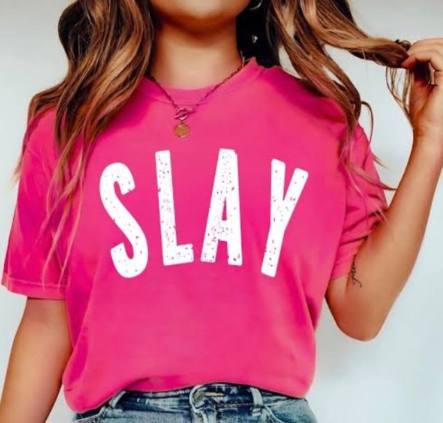 The “SLAY Vibe” aesthetic embodies confidence, empowerment, and a touch of playful sass, perfectly captured in this striking image of a woman wearing a vibrant pink tee. The tee itself is a hot pink short-sleeved shirt with the bold, white word “SLAY” emblazoned across the chest in a distressed font. The letters are chunky and eye-catching, giving off a youthful and energetic vibe that’s hard to ignore.