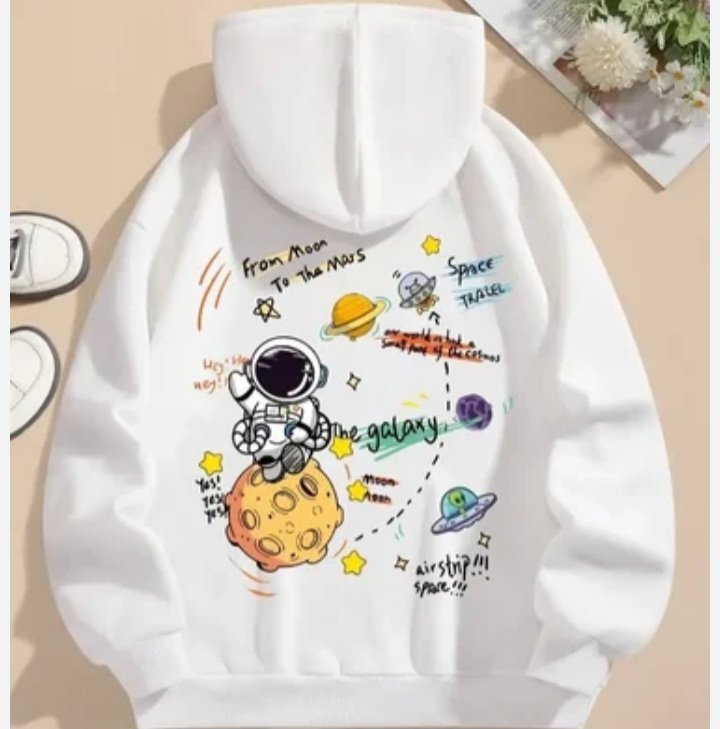 This cool white hoodie features a fun astronaut graphic on the back, sitting on a moon with space-themed doodles all around like planets, stars, and “Space Travel” text. Perfect for space enthusiasts! π