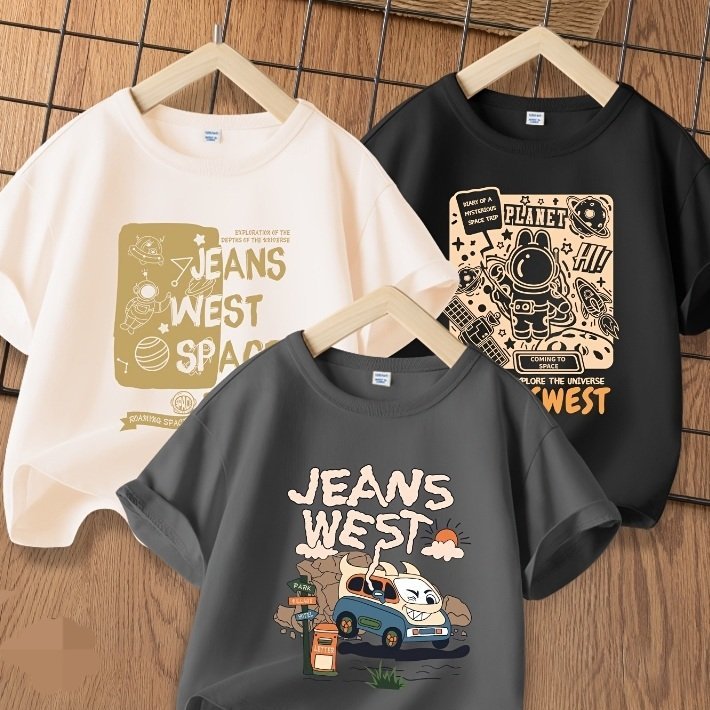 – *Gray tee*: Cartoon cars cruisin’ with “JEANS WEST” in peachy letters.