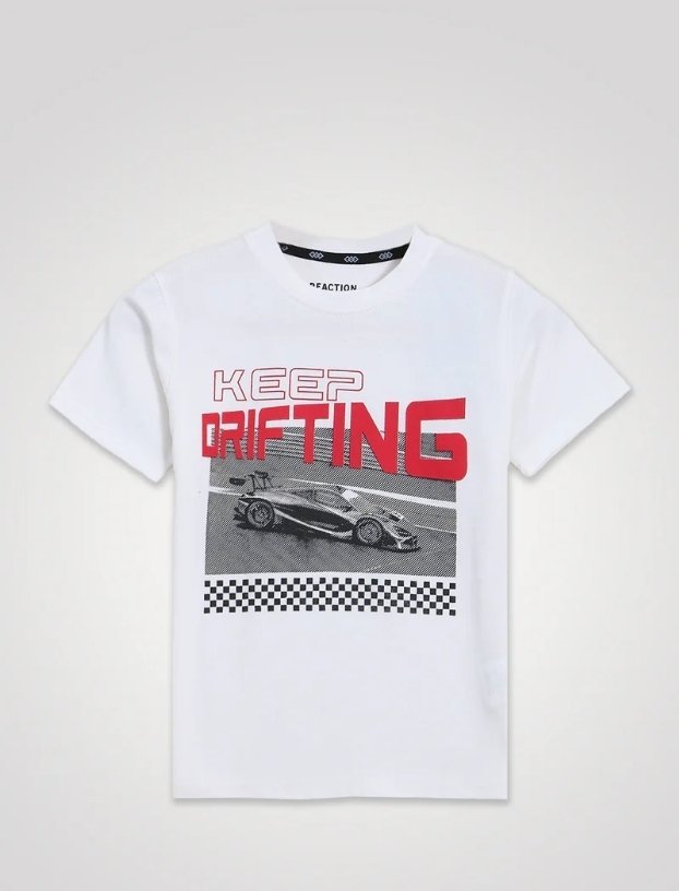 Below the car graphic, a black-and-white checkered pattern adds a touch of classic racing flair, reminiscent of checkered flags waving at the finish line π. The collar of the shirt has a black tag with the brand name “#EACTION” printed in small black letters, giving it a subtle branding touch.