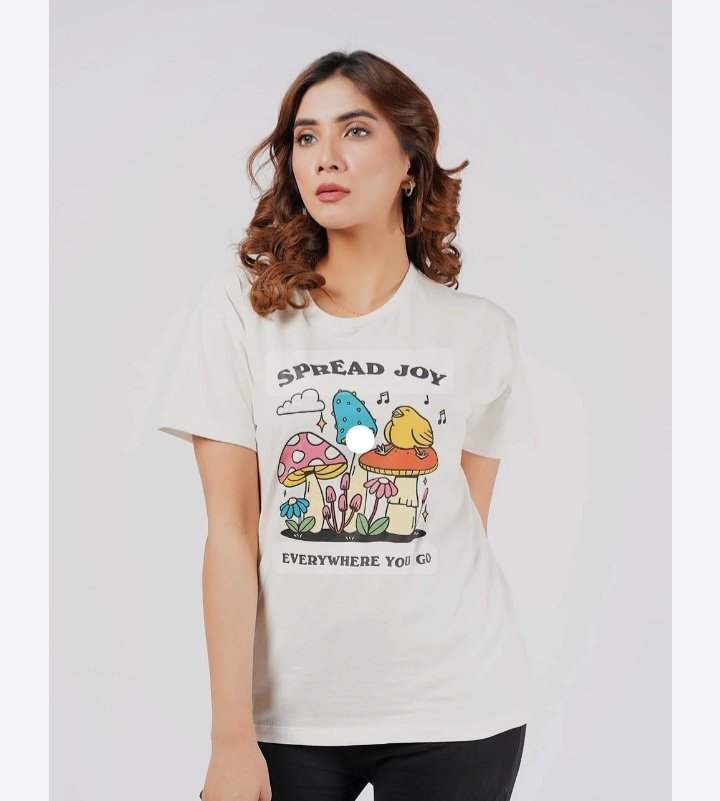 – *Overall Vibe:* The design on the tee conveys a positive message of spreading joy wherever you go. The use of colorful mushrooms, a bird, and musical notes gives it a fun, whimsical feel.