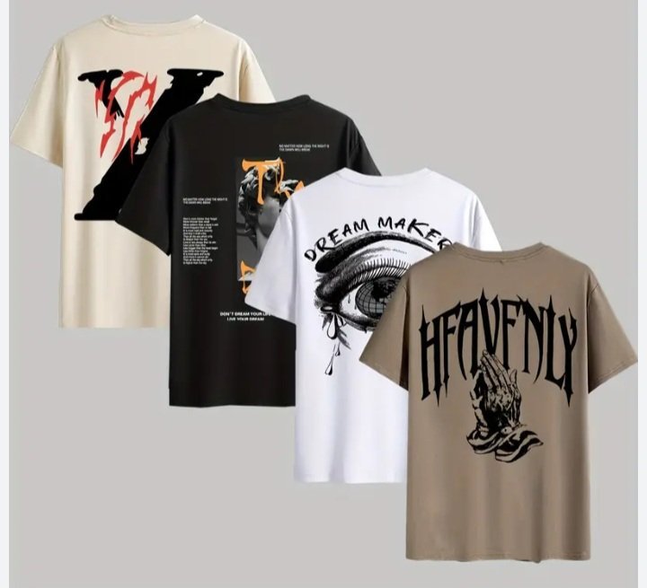 2. *Black Tee with Text and Image*: Behind the cream tee, this black shirt carries a mix of text and imagery on its back. Though the text is too small to decipher in the image, the overall design gives off a mysterious, thought-provoking vibe. It’s ideal for those who appreciate layered storytelling through apparel.